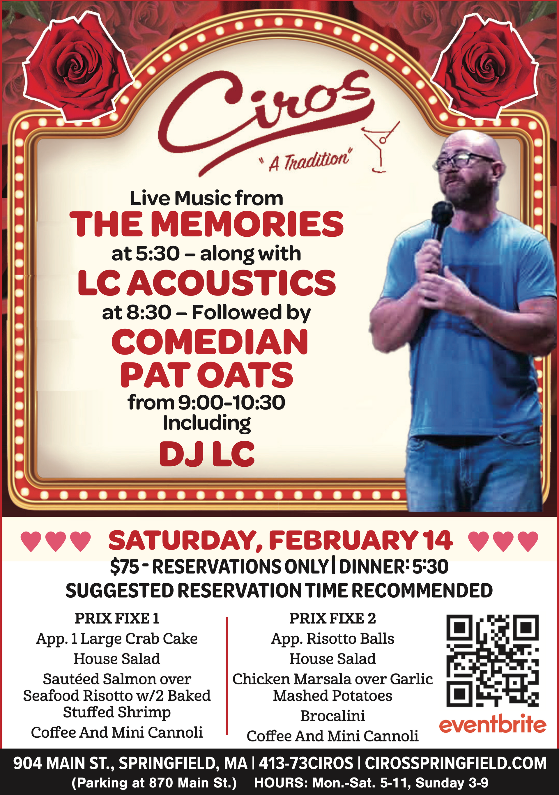 Reservations starting @ 5:30 P.M. February 14th. Live music with the "Memories" followed with DJ LC, and Comedian Pat Oats.